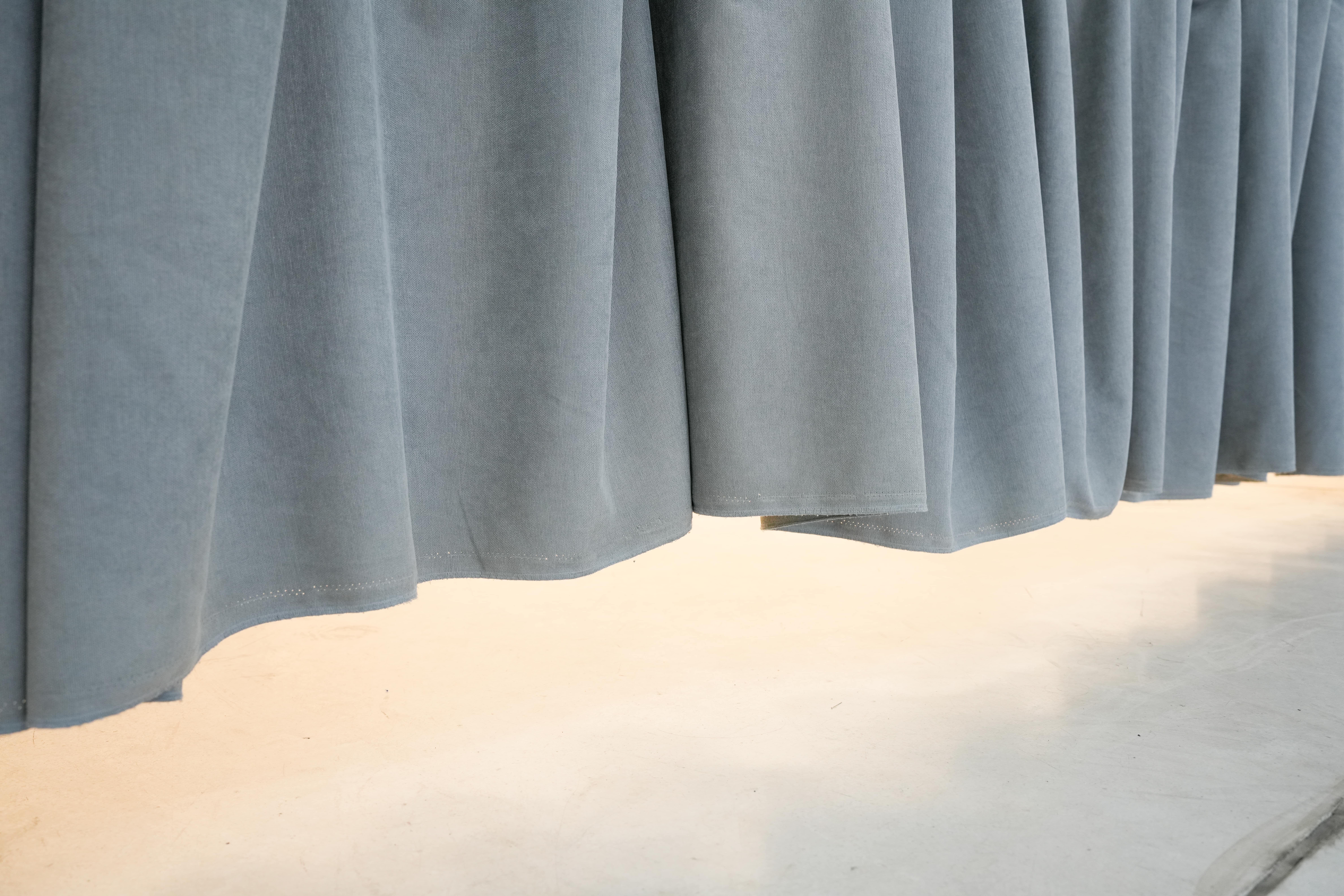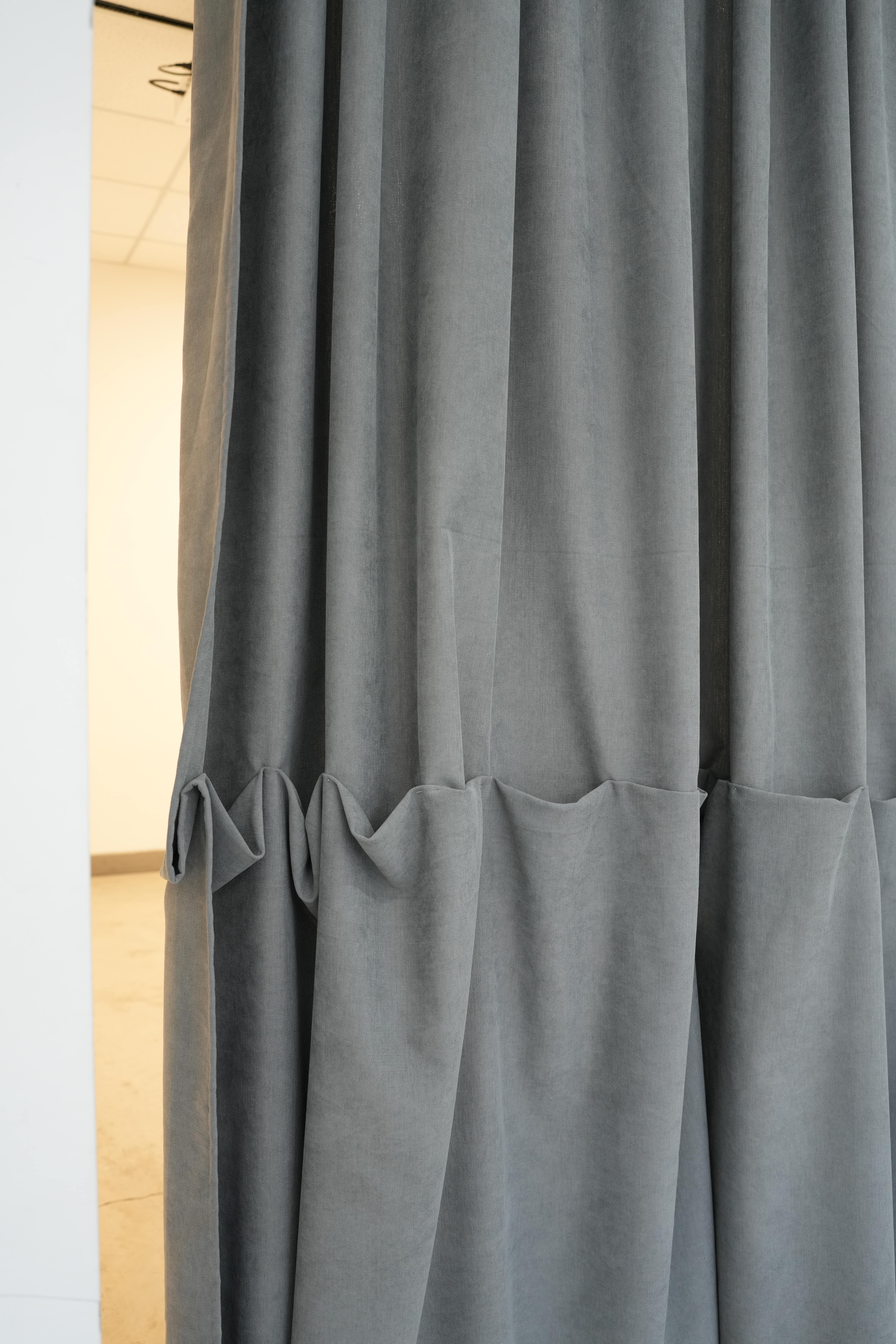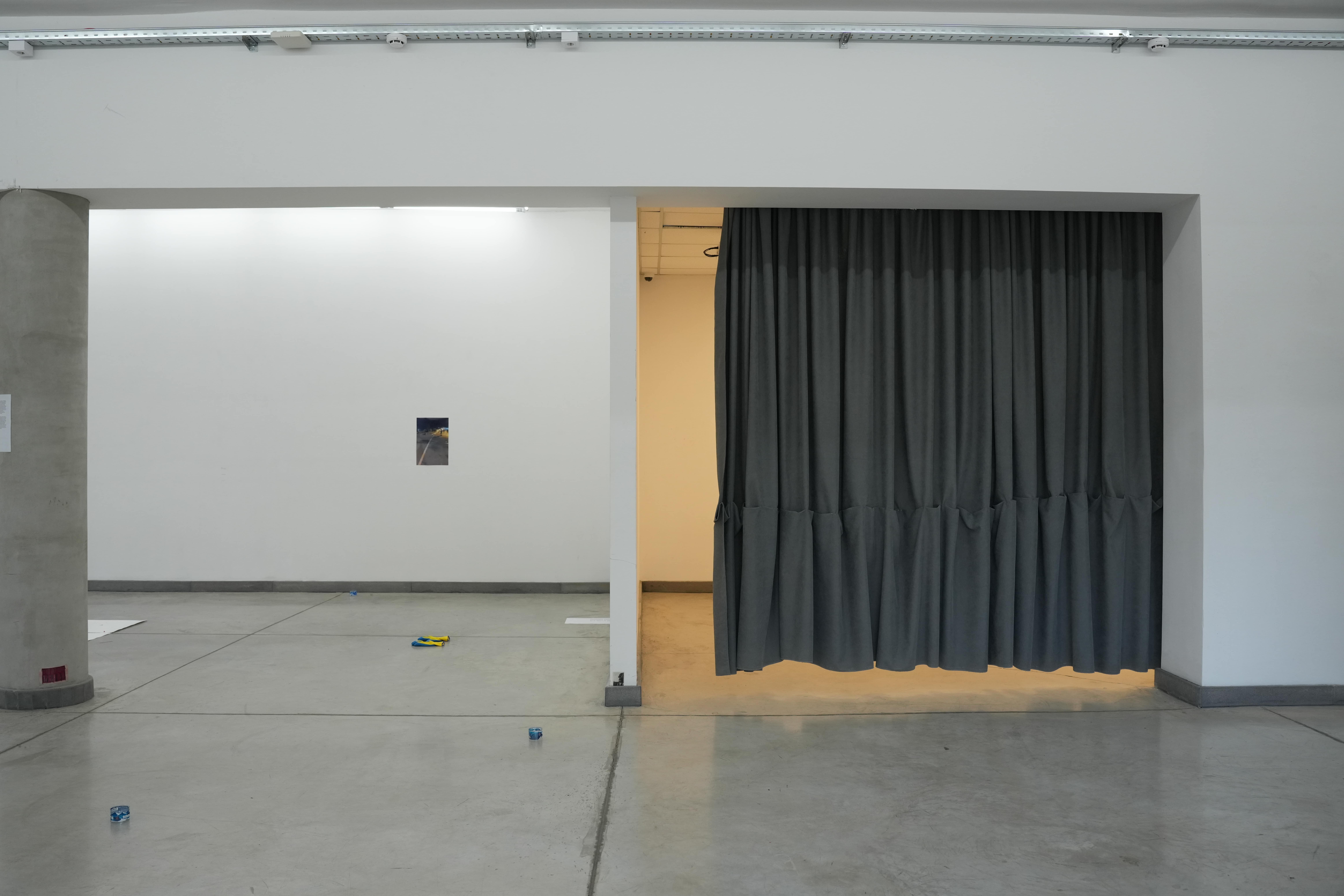 [2025]enad-hoc intervention in the exhibition space of the Campus Gallery in Tbilisi. shortening of the existing curtain to the level of the walls´ base and modality of space in real-time. curtain, pins, dimensions variable