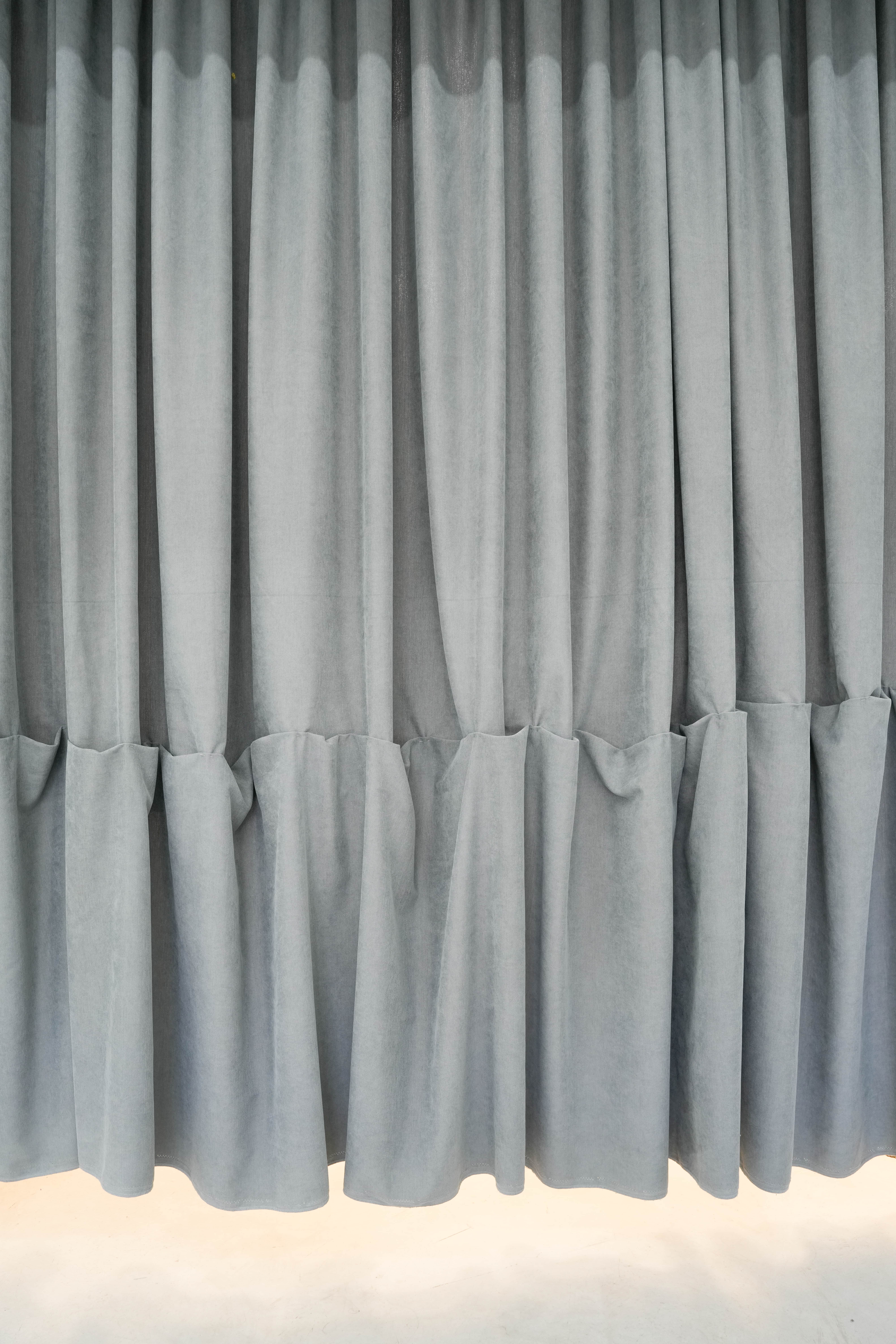 [2025]enad-hoc intervention. Entry in the space behind the curtain not allowed. Shortening of the existing curtain to the level of the walls´ base. Proposal for the simultaneity of a multitude of moments.curtain, pins, turned on lights behind the curtain, dimensions variableInstallation: Campus Gallery, TbilisiDocumentation: Ilinca Fechete